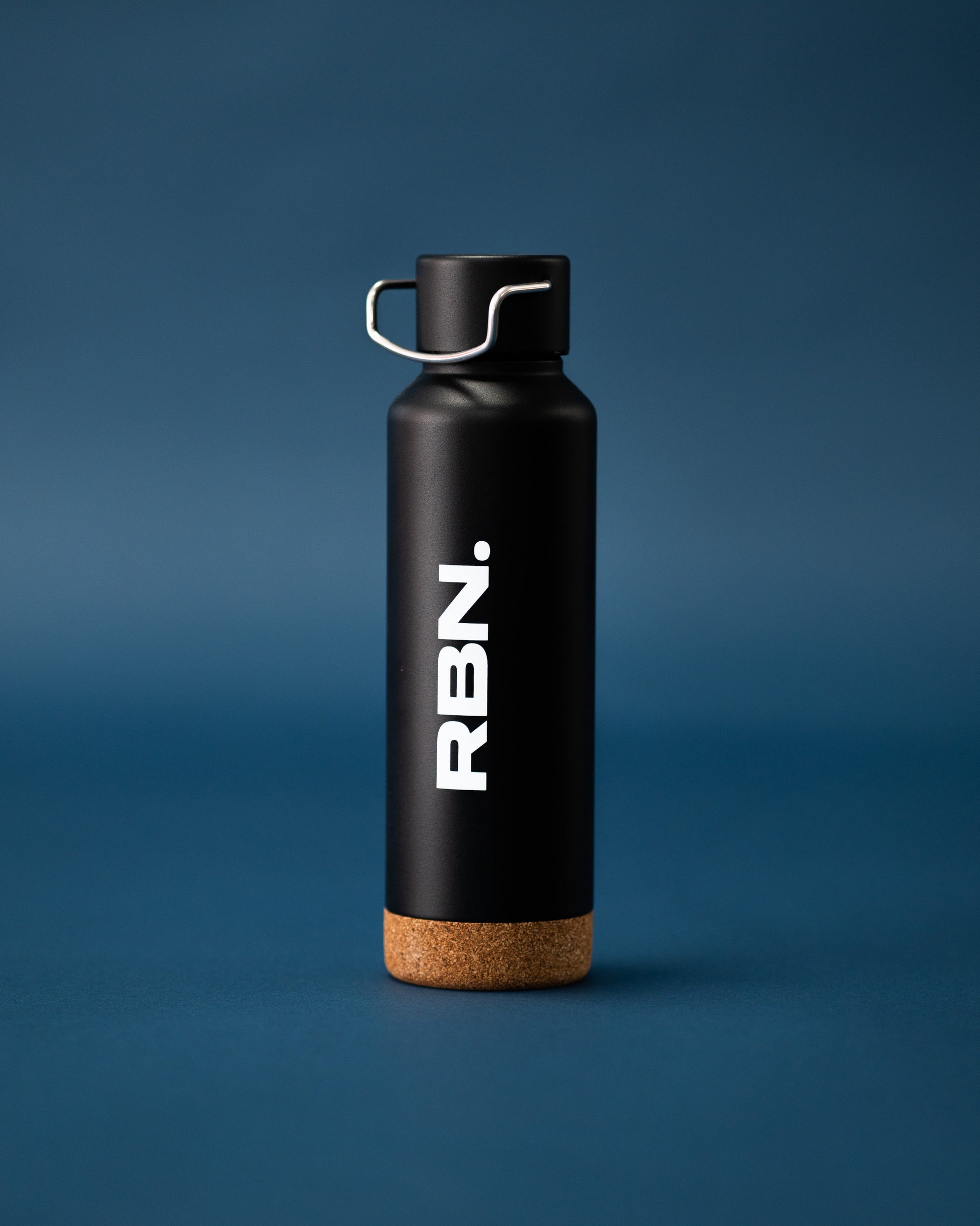 Stay hydrated during your workouts with our RBN. Premium Water Bottle. Featuring a sleek gun metal galvanised finish and a stylish cork bottom, this bottle combines functionality with a modern aesthetic. Its durable design ensures it can handle your active lifestyle, while the wide mouth allows for easy filling and cleaning.